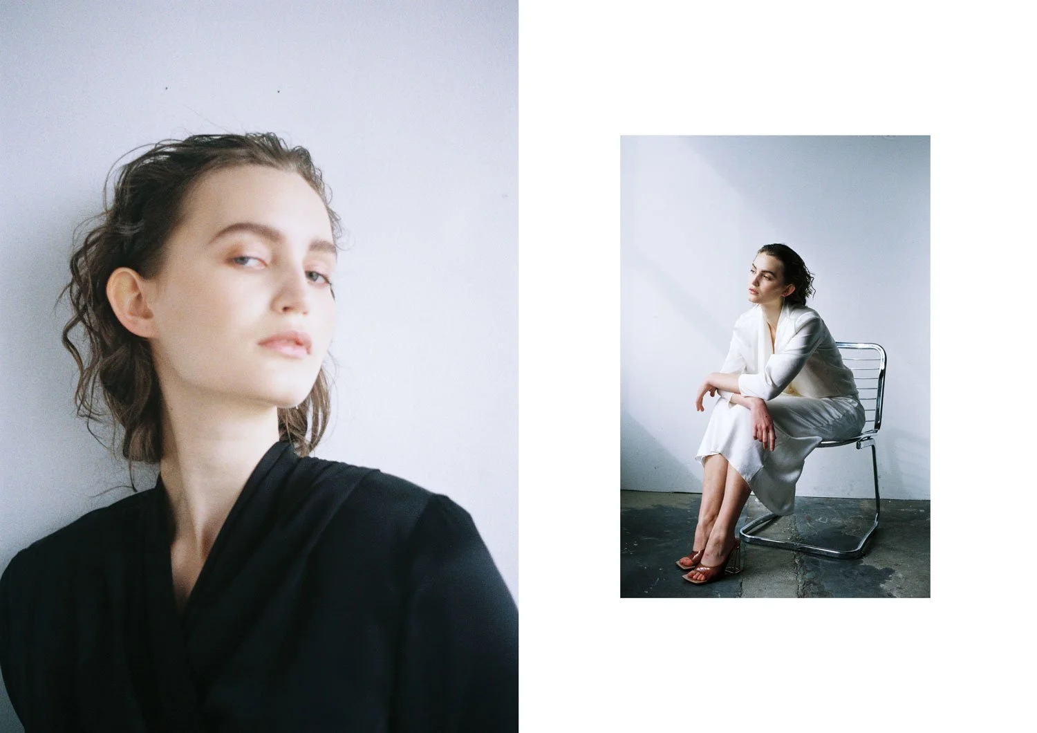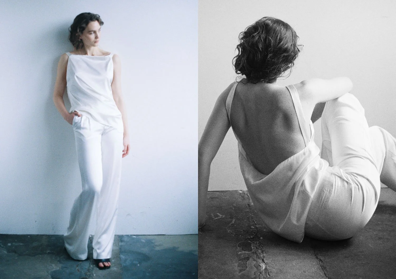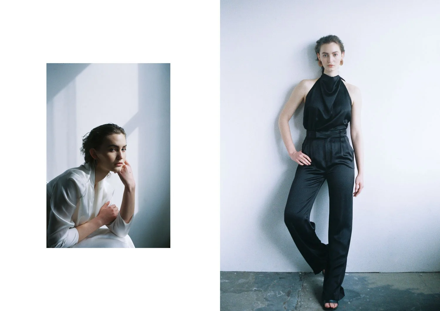 Left: NECKHOLDER TOP IN BLACK / Right: WRAP BLOUSE IN NATURAL WHITE