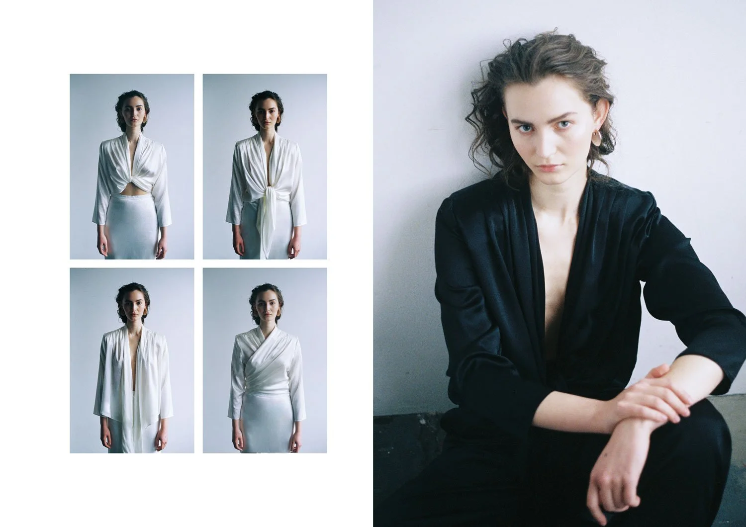 Left: WRAP BLOUSE IN BLACK / Right: WRAP BLOUSE IN NATURAL WHITE