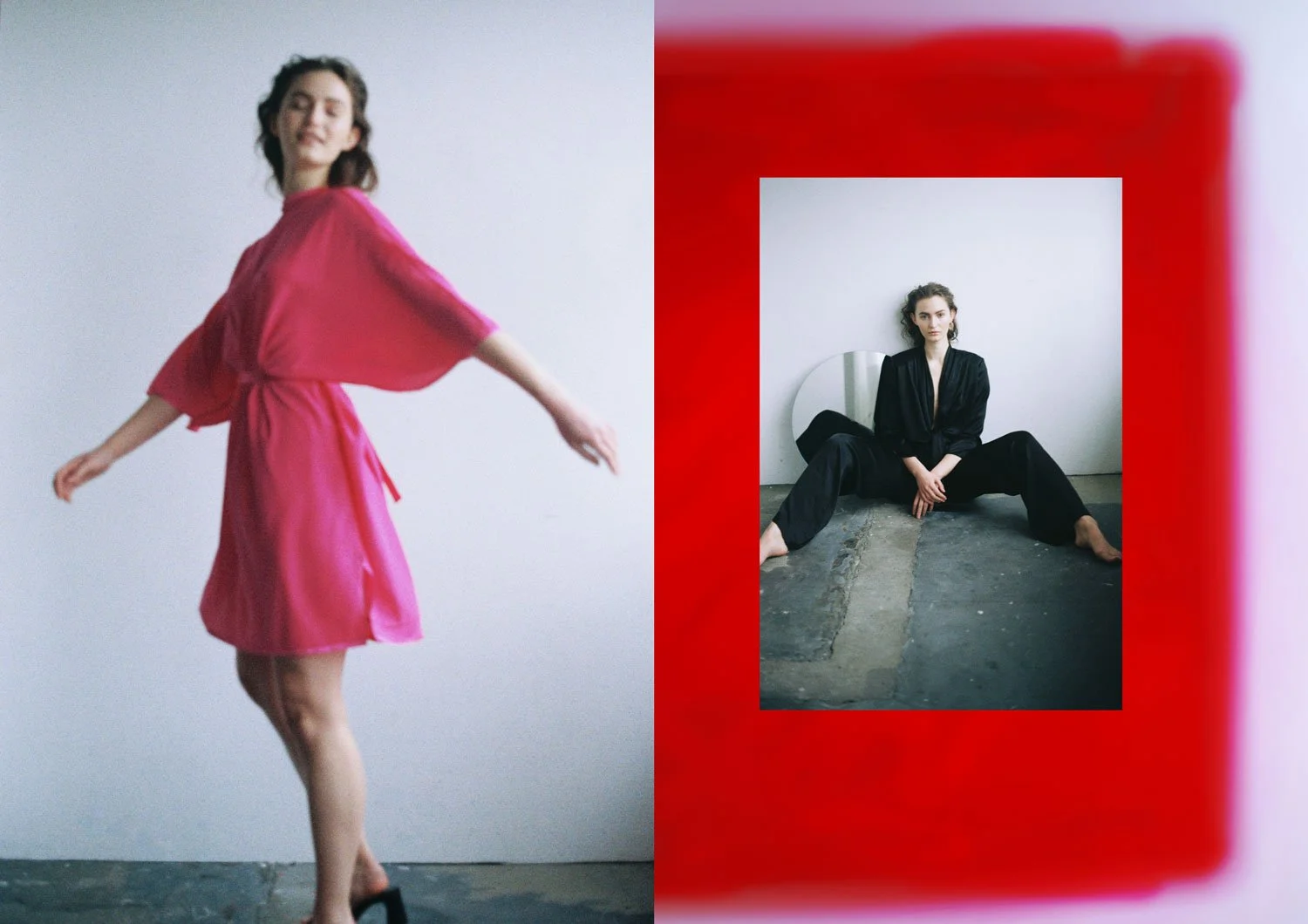 Left: KAFTAN IN PINK / Right: WRAP BLOUSE IN BLACK