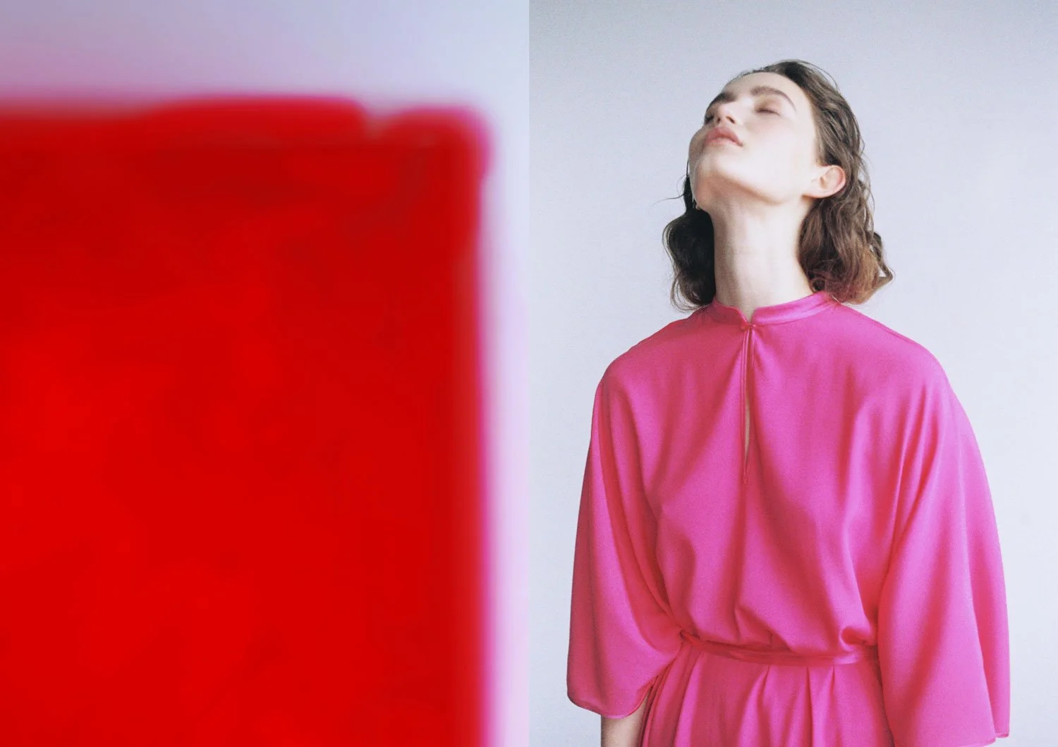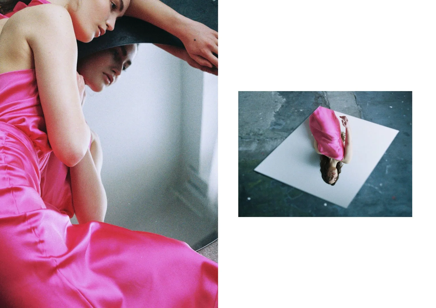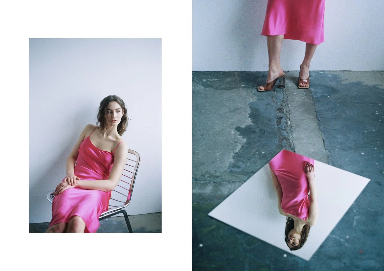 Left: NECKHOLDER TOP IN PINK & MIDI SKITRT IN PINK / Right: SLIP DRESS IN PINK