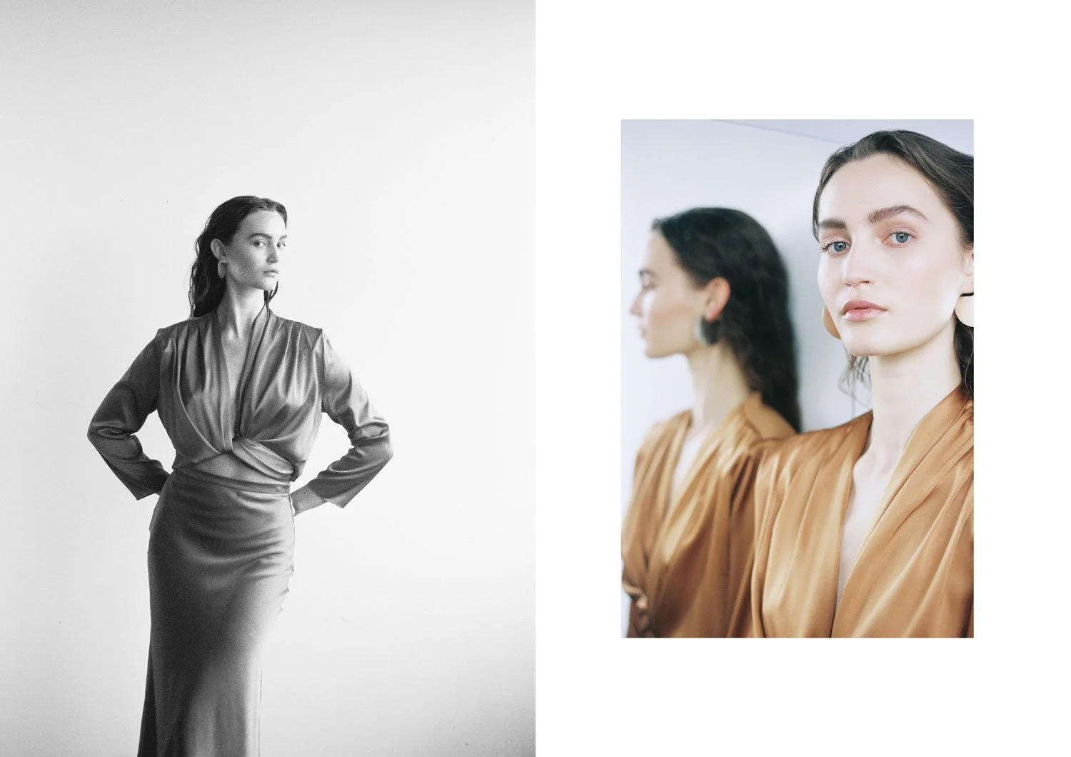 Left: KAFTAN IN CHAMPAGNER / Right: WRAP BLOUSE IN NATURAL WHITE